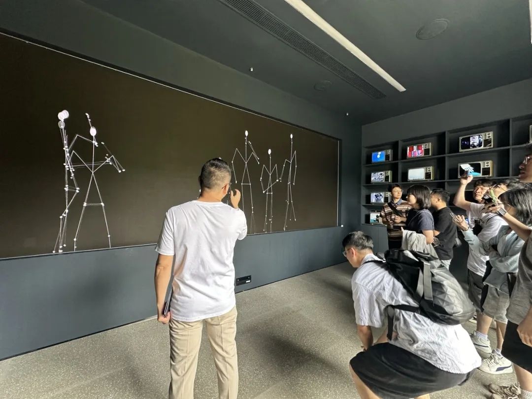 公司合伙人胡登群带领我们参观了该公司与深圳市人工智能与机器人研究院联合设计的装置艺术企业展厅,为我们讲解企业与艺术家如何探索与构建“人工智能AI+机器人Robotics”的议题,利用具有丰富含义的装置艺术符号叙事,引导大家对时空、生命、存在、意识、智能等概念的思考,拓展了我们认知的边界。