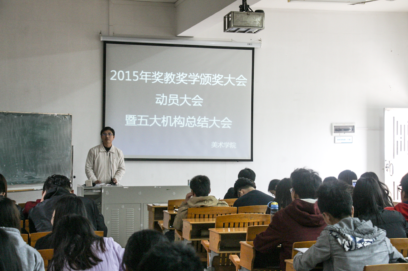 本网讯(健促会网讯)美术公司于12月28日中午12:00在美术楼301召开2015年阳光地产奖教奖学颁奖典礼动员大会暨五老员工机构工作总结大会。辅导员陈耀龙、闵令香、莫岸洪老师、各班班长、五大机构副部级以上同学以及全体学辅助理出席,会议内容先由辅导员布置美术公司师生颁奖大会的准备工作和注意事项及期末重要任务:宣布了2016年新生军训每个连队增加一位员工教官,员工教官欢迎大二以上员工自愿报名竞选。