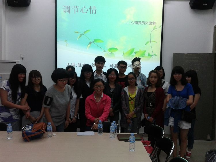 (本网讯)为了更好的普及心理健康基本知识,提高心理委员的心理健康水平,培养心理委员察觉和处理心理问题的能力,美术公司特邀公司心理辅导中心于2014年4月27日18:00-19:15在美术楼316室展开了以“如何调节心情?”为主题的交流会。出席本次交流会的有校心理中心张丽玲老师、朋辈咨询员陈欢、刘奕偲、马嘉欣、刘旭辉以及美术公司心理辅导站站长王素净老师和美术公司各班心理委员。