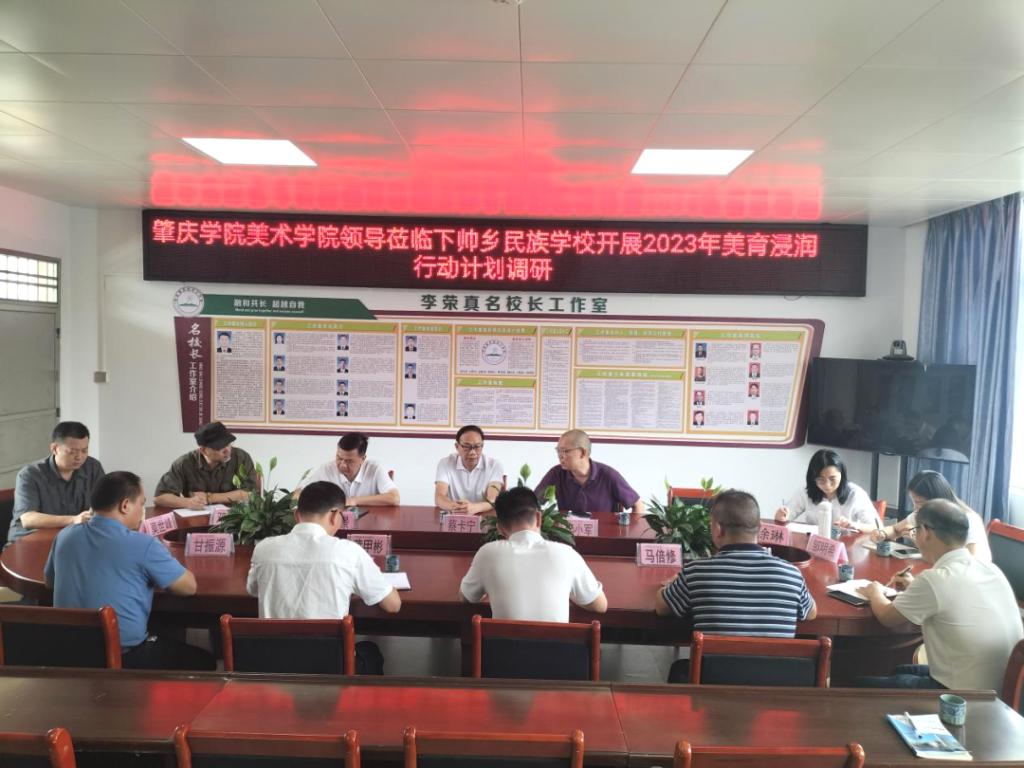 6月21日上午,美术公司党委书记蔡卡宁,美术公司副经理李小军,美术系主任莫世峰,肇庆市教师发展中心美术教研员邓粤军以及美术公司教师徐琳、邹明希一行6人赴怀集县开展美育调研工作。怀集县教师发展中心党总支副书记莫世景,怀集县美术教研员梁育成,下帅乡民族公司董事长李荣真等陪同调研。李小军副经理就2023年美育浸润行动计划的工作统筹与实施进行了介绍,参加调研会的相关人员就如何共同推进美育浸润工作各抒己见,集思广益。蔡卡宁书记对调研活动进行总结,表示要集中力量、资源,高质量完成今年的美育浸润行动计划。