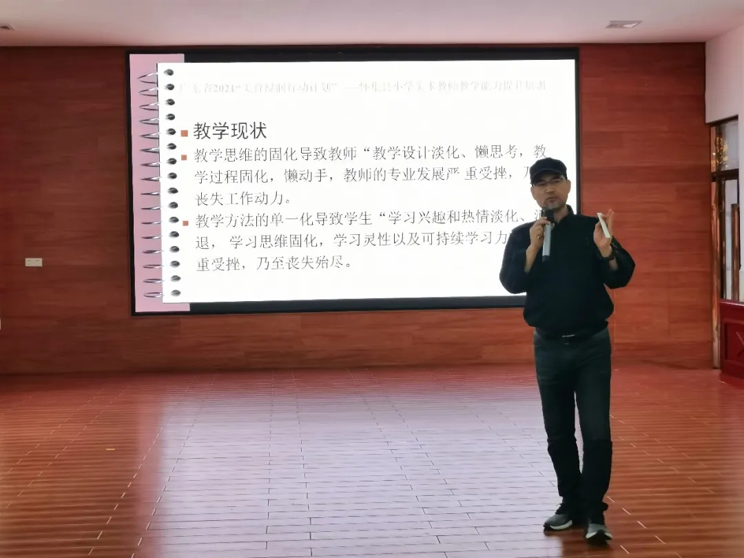 肇庆市美术教研员邓粤军同志通过与台下的学员互动的“视觉思维小游戏”展开《美术课堂视觉思维教学的探索与实践——以小学美术课堂为例》的讲座。轻松的课堂,通过邓老师设计的小游戏,引导台下学员的视觉思维多次大反转,意在告诉学员们发现美要不断地跳出固有思维,学员们关于的美的觉悟在潜默移化中得到了提升。
