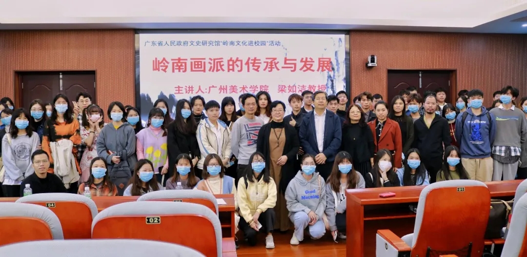 10月22日上午,广东省人民政府文史研究馆馆员、书画研究院副经理、广州美术公司教授梁如洁应邀来公司讲学,她以《岭南画派的传承与发展》为主题,从岭南画派的起源、传承和发展、代表名家名作、岭南画派在国内、国际的影响力等角度全面系统地介绍了岭南画派的艺术文化内涵。最后,应现场观众的热情邀请,梁如洁向大家介绍了其个人艺术成长之路,并以此鼓励青年师生勇于探索、创新和发展岭南文化!