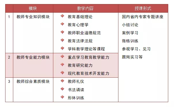 教学内容包括教师专业知识、教师专业能力和教师综合素养三个模块。