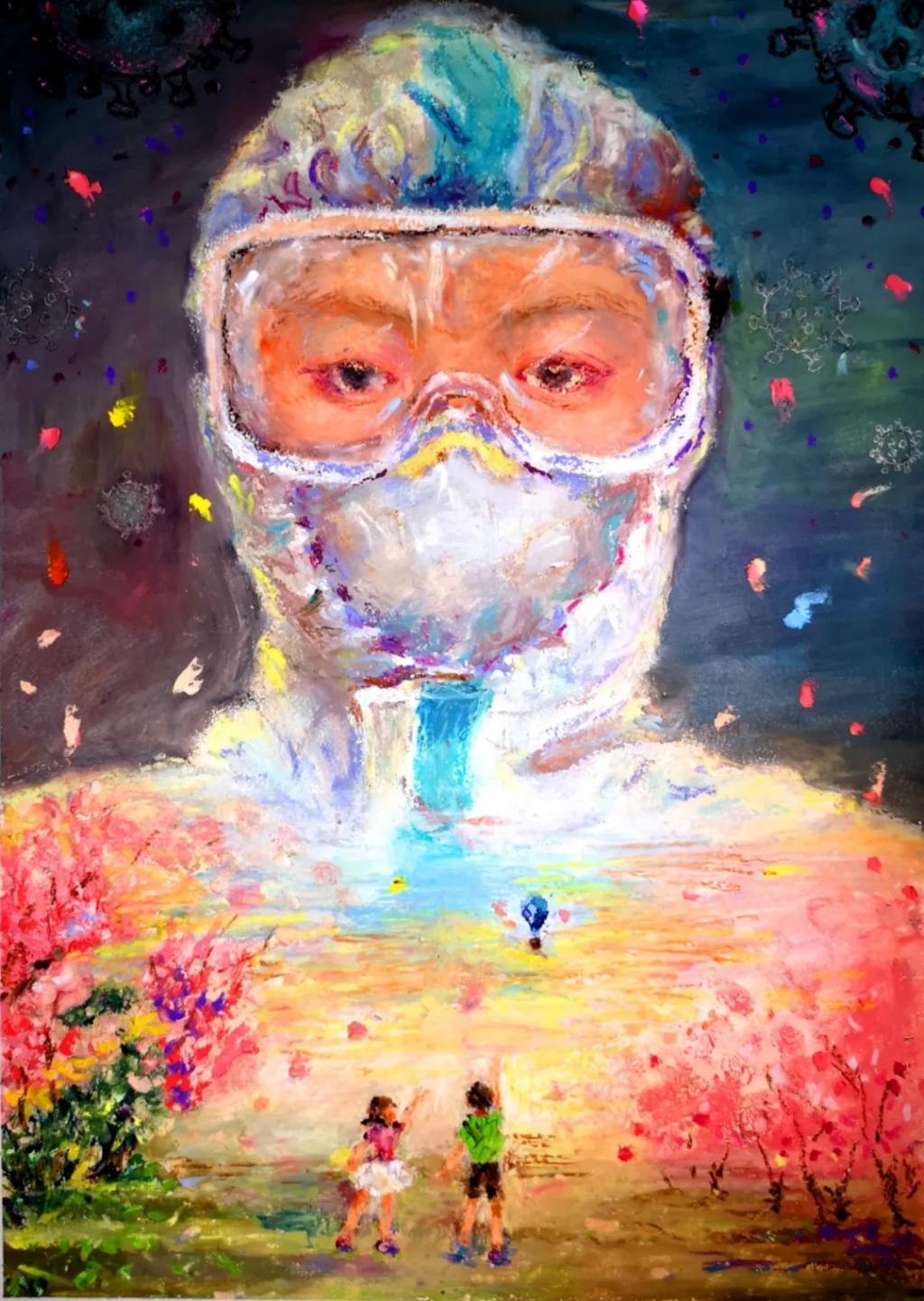 这是73岁李兰娟院士进入武汉大学人民医院东院ICU查房。在查房结束时脱单防护装备,面部的压痕清晰可见。这也是我创作的灵感来源,如今的医生护士日夜奋斗,为的就是早日战胜疫情。他们的工作伟大而圣神,用自己的性命去拼搏。他们每日穿着防护服因此而就下深深的痕迹,而在我看来这些痕迹都是美丽动人的。用花的形式表达这些压痕,向人民表达出我的想法。如今让的力量是渺小的,但人民的力量的伟大的。现在需要我们团结一致去对抗战役。