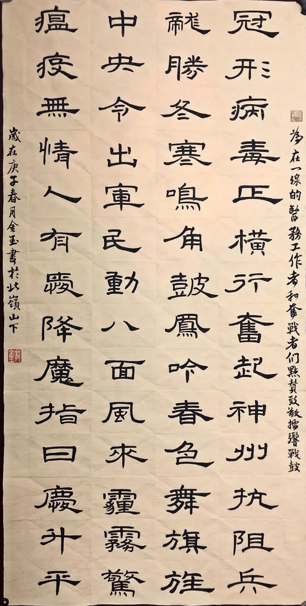 这书法创作是为了这场冠状病毒疫情,在一直为这场战疫的奋战者而写的,主要是七言诗运用了书法中的隶书字体书写的。在新的一年2020年,给予了我们很大的挑战,疫情状况在全国蔓延,甚至全球,让我们过上了一个很艰巨特别的春节,每天看到新闻播报时,看到了每位医生,护士,警察,一些小区的管理员等等,都在默默努力奉献。尤其是一线的奋战者们,有的人牺牲了自己性命,有的人失去了家人,有的人一天没有正常休息,脸上满满伤痕。看到的每天新闻有时候都感动流泪,最近疫情状况慢慢好转,也是令人欣慰的,56个民族是一家,有困难一起扛,风雨同舟,齐心抗疫,同时为在一线的医务工作者和奋战者们点赞致敬,擂响战鼓,共克时艰,我们一起加油!