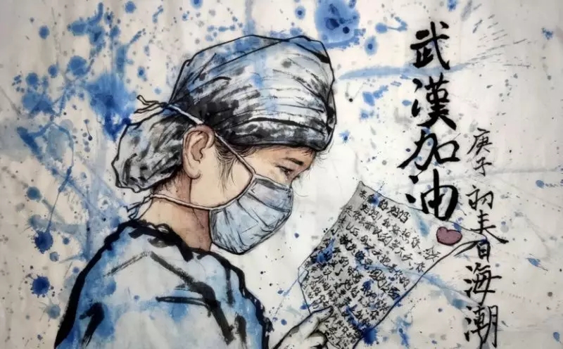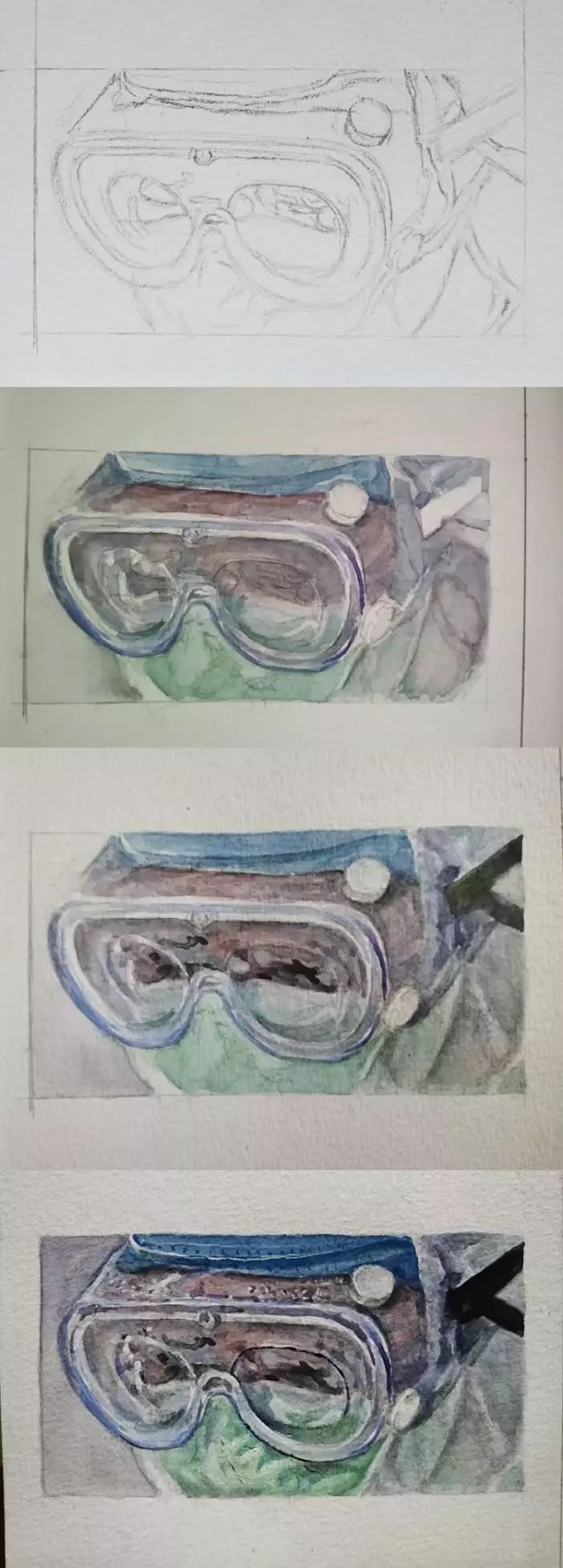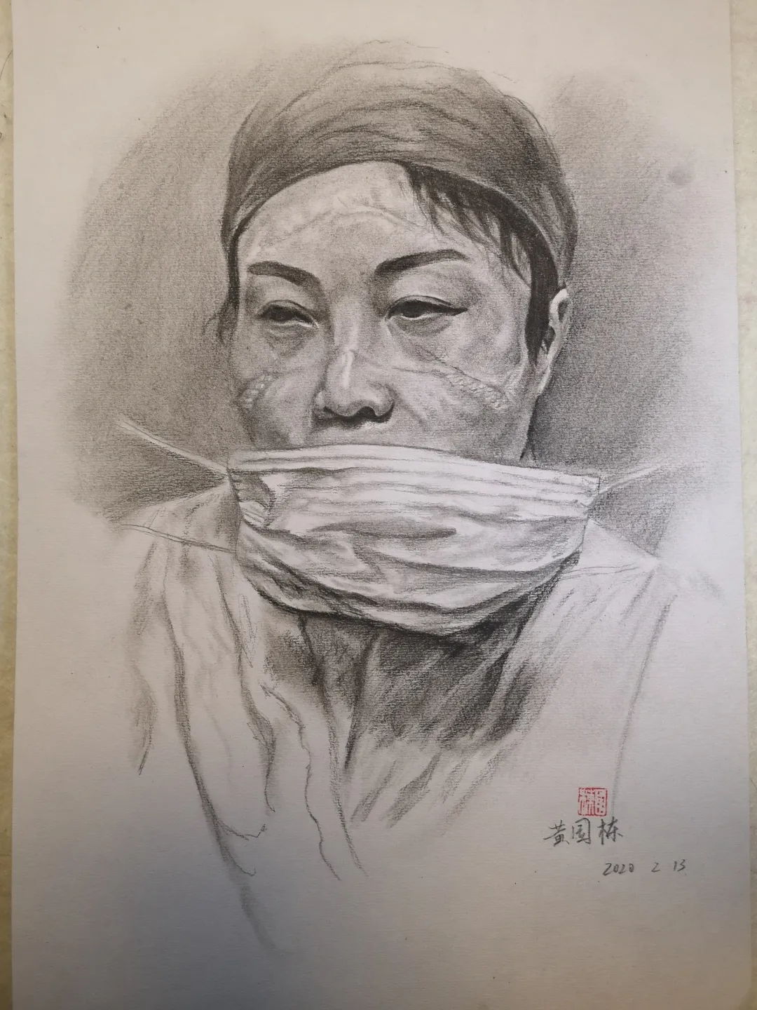 那是一群勇士!春节!一个家人团聚的日子,他们毅然离开了家!匆匆忙忙的与家人告别!坐上了飞往武汉的飞机,与新型冠状病毒作斗争!当从抗击疫情第一线传来这些勇士战斗的照片。是感动!更是敬佩!一位无名的勇者,在她摘下眼罩口罩的瞬间,那原本应该光滑柔嫩的脸颊是一道道的勒痕!那数条深深的红印!双眼里透露的是疲倦!是那么的暗淡却透露出一丝坚定。看到这些!我的心在颤抖着!女生是爱美的,是什么样的精神,什么样的决心,什么样的信念支撑着她在如此狼狈下...或许在病人眼里,或是病人家属眼里,或是医院同事眼里,带上口罩,穿上防护服是整洁的是帅气的,但在这之下...看到这一幕我忍不住画下来并取名《口罩下的疲倦——致敬勇士》。
