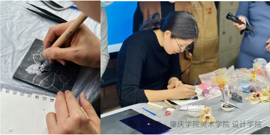 徐琳讲解戗金技法与碳粉堆填等核心技法。戗金以刀代笔,金线流转赋予画面光效。碳粉堆填则通过粉末的层层堆积与打磨,营造出深邃而斑驳的独特肌理。这两种技法一明一暗、一锐一浑,充分展现了漆画材料语言的丰富性与表现力。