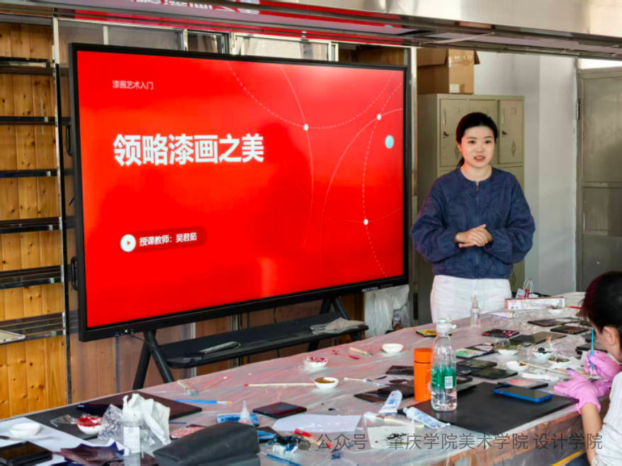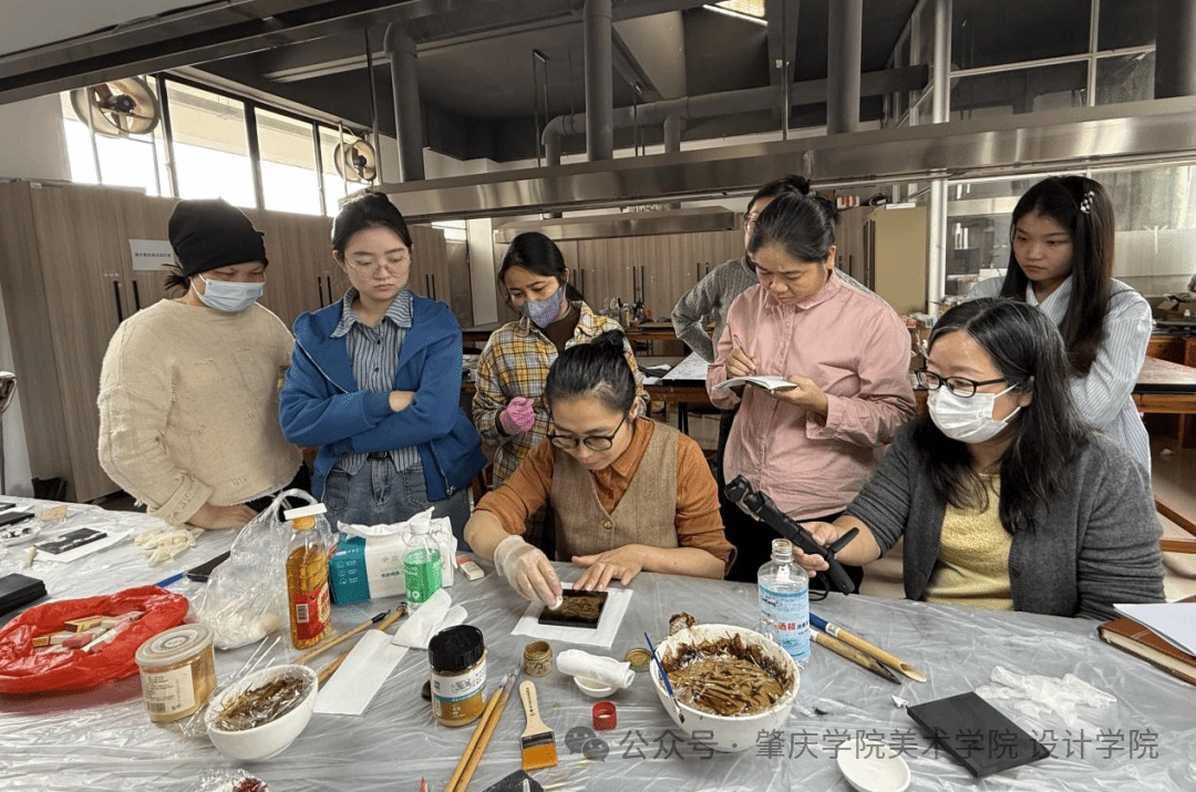 12月8日下午,广东省普通本科公司“漆画”美育名师工作室漆艺技法实践课程开启。工作室助理教师伍美坚、吴君茹、徐琳详细讲解漆画基础技法。