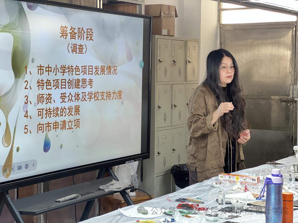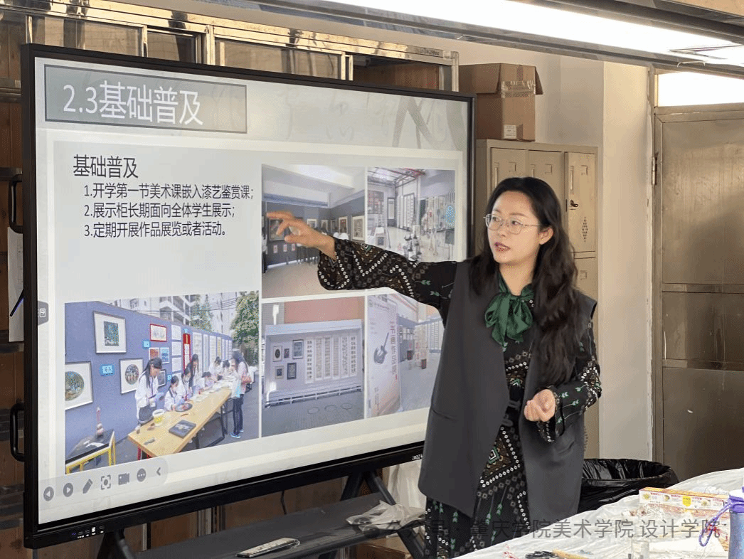 12月10日下午,“漆画”美育名师工作室一行到达珠海高新区金鼎第一小学参观交流。金鼎第一小学教师毛延昕以“一块漆板的诞生”为引,阐述了中小学漆画特色工作坊建设从“术”至“道”的立体化路径。在“术”的层面,她分享了如何利用区域项目资金,历时五年打造专业化漆画工坊,并构建了从低学段绘本启蒙、中学段非遗技法融合到高学段综合创作的螺旋式课程体系。在“法”的层面,她强调成果的系统梳理与品牌化推广,通过课题研究、文创开发、媒体宣传等方式,让漆画教学走出校园。而在“道”的层面,她回归育人初心,以漆树生长比喻教育规律,以“一层漆一层故事”诠释耐心陪伴的价值,强调漆画教学不仅是技艺传承,更是文化自信的培育与人格养成的漫长修行。