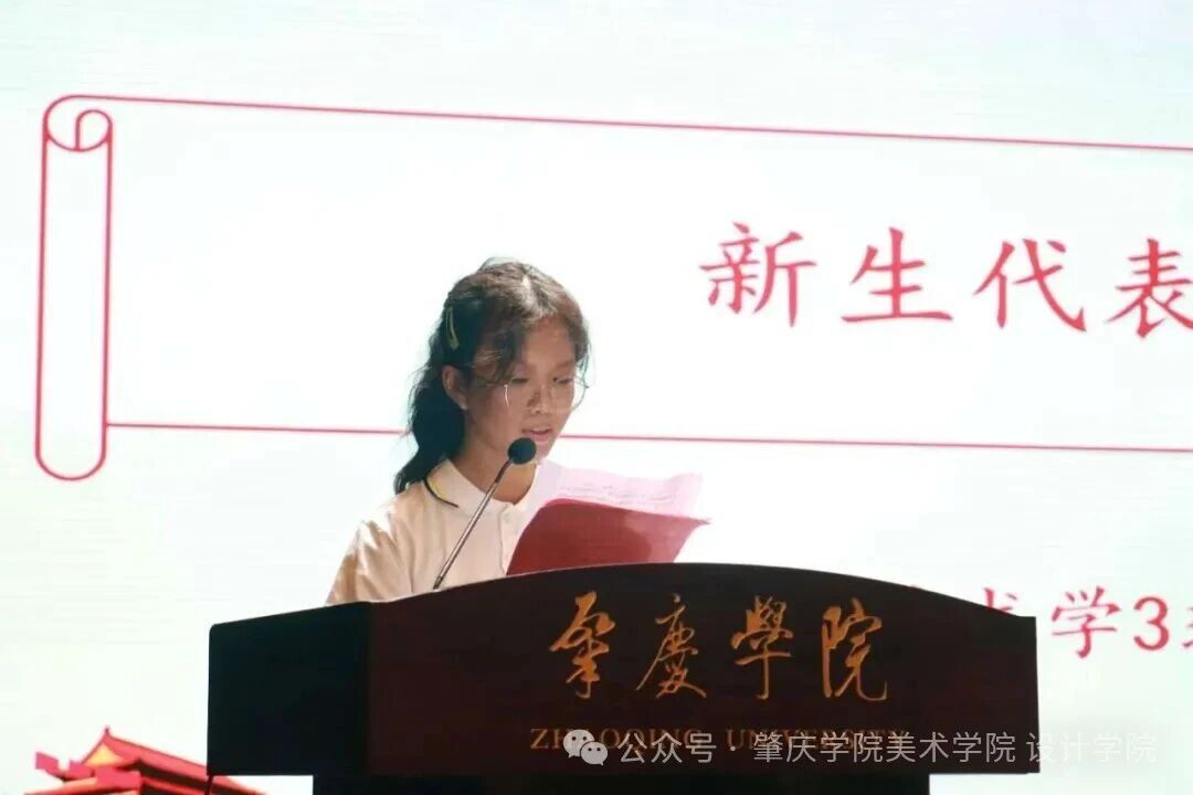2025级美术学3班孙晟尹同学作为新生代表发言。她表示将倍加珍惜宝贵的大学时光,以勤勉为舟、智慧为帆,专注学习专业知识,不断拓宽视野提升自我。她承诺将以认真负责的态度对待艺术追求和生活中的每个细节,学会自律和规划。同时,她也表达了积极参与社会实践和公益活动的愿望,勇于承担新时代青年的社会责任,用画笔勾勒梦想,以专业所学服务社会,努力描绘属于自己的精彩人生画卷。