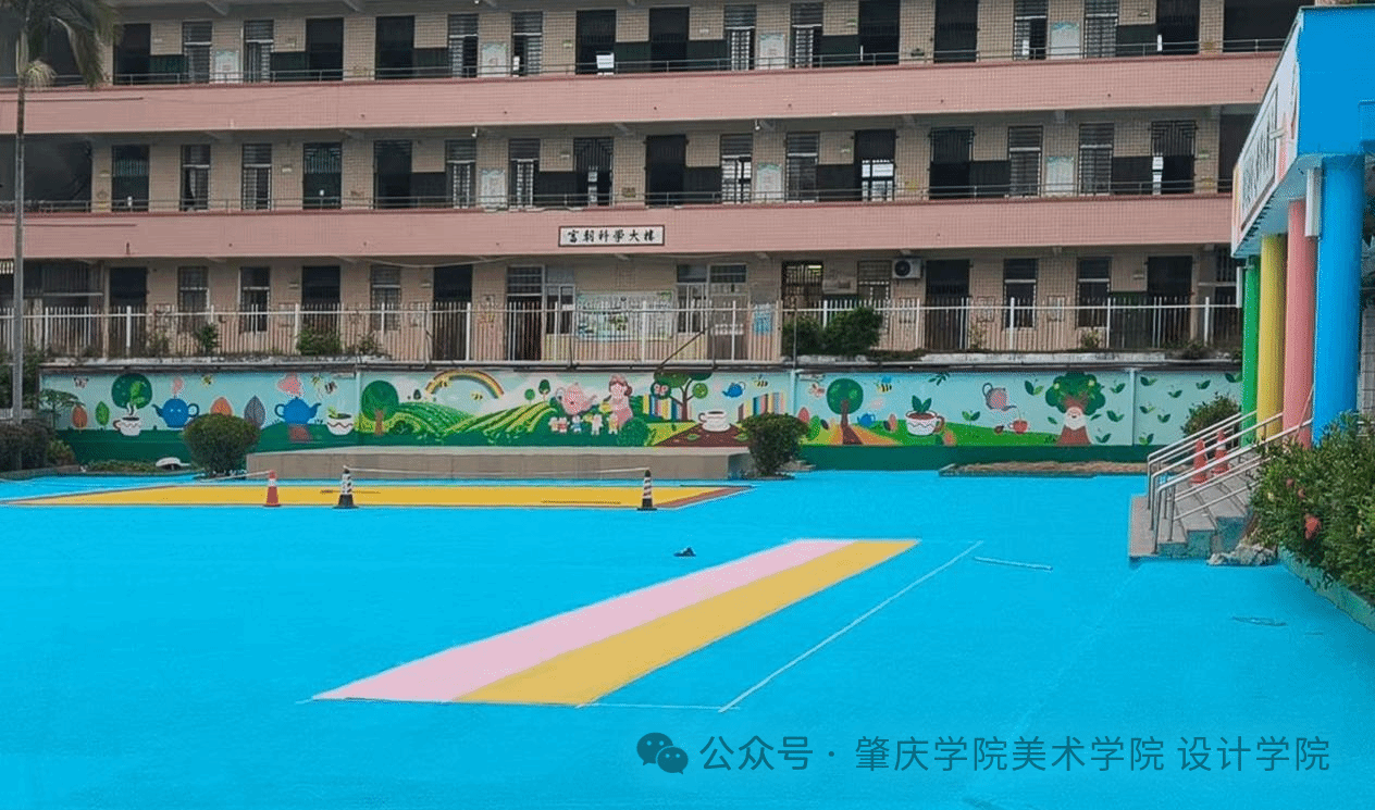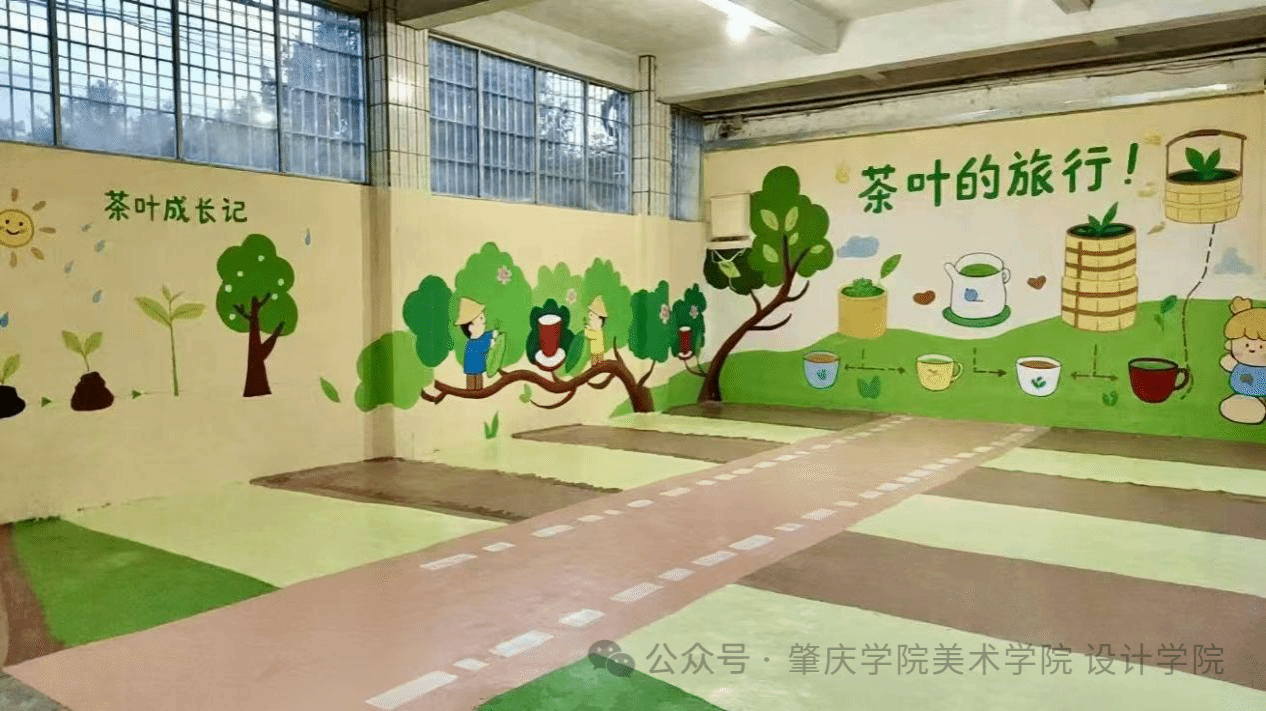 实践团精准对接项目要求与幼儿园需求,让校园旧貌焕新颜:一楼半开放活动区,地面以防滑颜料绘出田垄纹路,墙面分“茶叶成长记”“茶叶的旅行”两大主题,用卡通线条呈现茶叶生长、制茶全过程,还嵌入可触摸的茶叶纹理浮雕,适配幼儿探索天性;校门口百米旧围墙曾因年久褪色干裂,团队先细致打磨补缝、涂刷抗碱底漆,再以“茶园里的美好时光”为主题彩绘覆盖,阳光茶园、亲子采茶的温馨画面,让旧墙成为传递地方茶文化的鲜活载体。