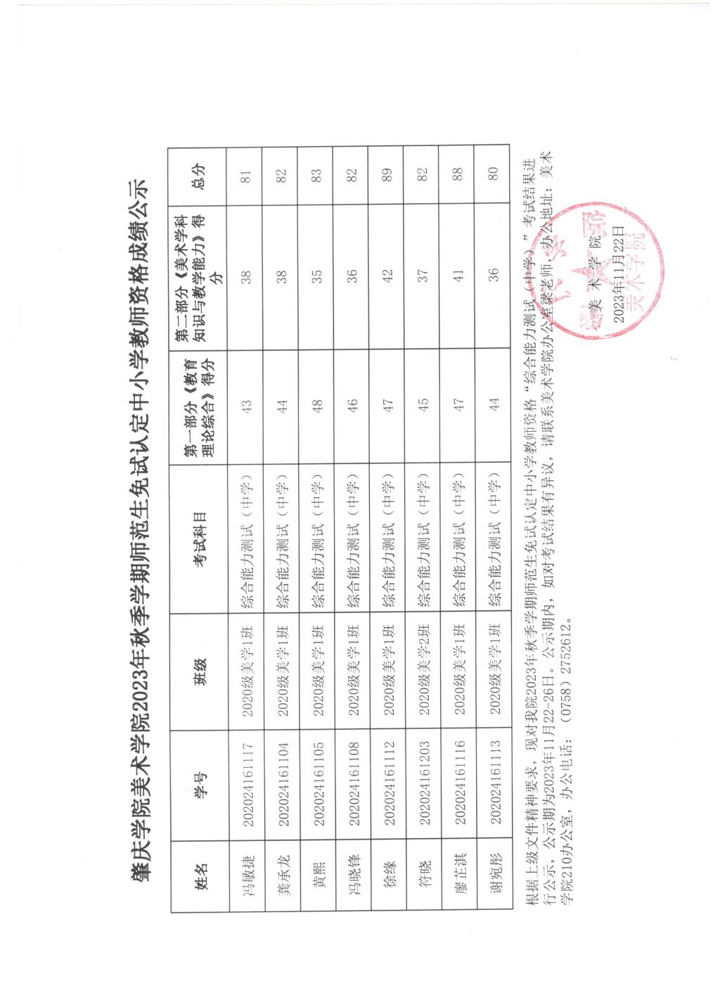 根据上级文件精神要求,现对公司2023年秋季学期师范生免试认定中小学教团队格“综合能力测试(中学)”考试结果进行公示,公示期为2023年11月22-26日。公示期内,如对考试结果有异议,请联系美术公司办公室梁老师,办公地址:美术公司210办公室,办公电话:(0758)2752612。